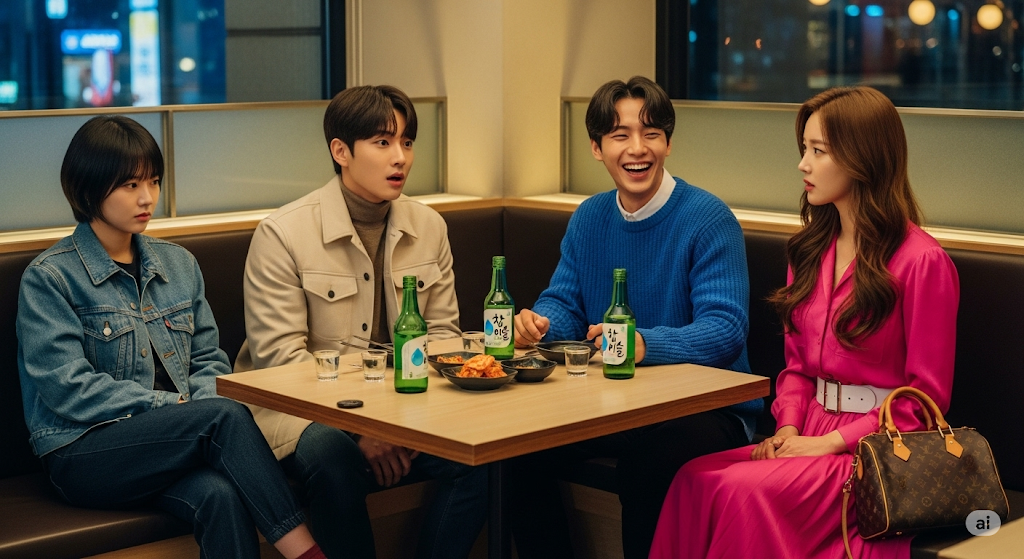 столиком Юн Ми, Чжу Вон, Чон Хан и Юджин.