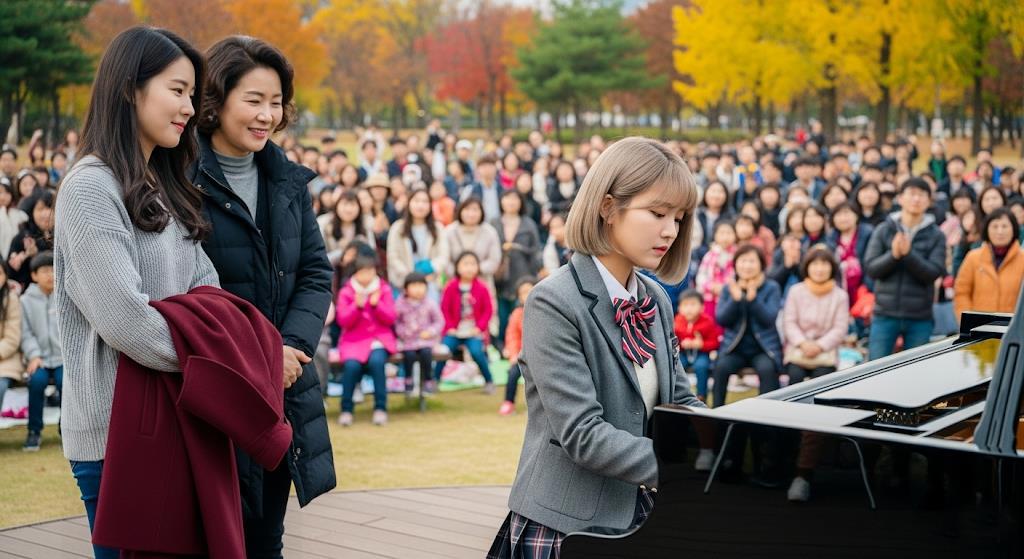 Сеульском Парке. Юн Ми играет на рояле на уличной сцене.